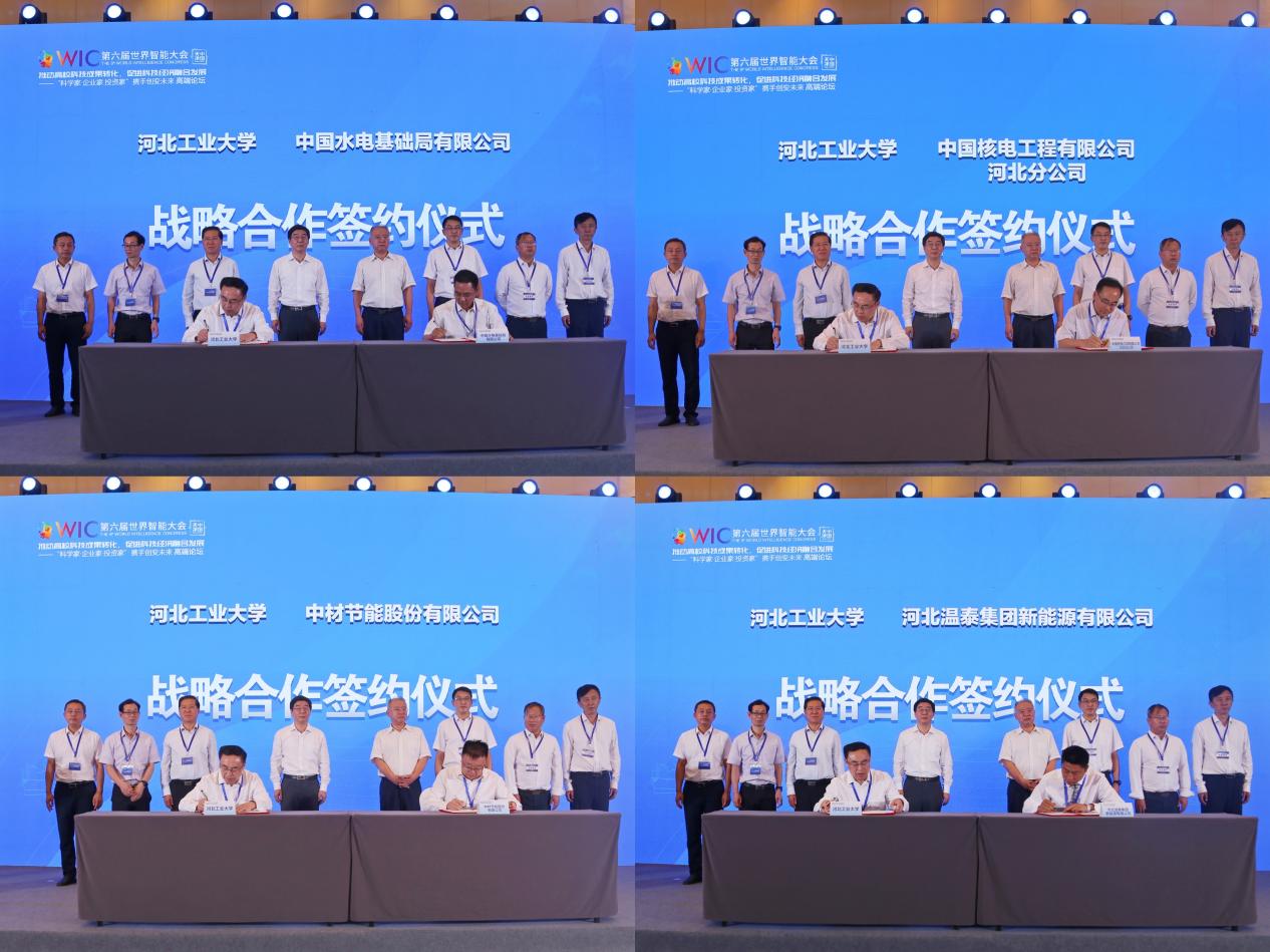 6月25日,第六届世界智能大会“推动高校科技成果转化,促进科技经济融合发展高端论坛”在津举行。高校、政府、企业“三方”携手搭建平台,“科学家、企业家、投资家”围绕科技成果转化,科技经济深度融合发展展开研讨,携手创变未来。校党委书记韩旭与市科协党组成员一级巡视员卢双盈、副校长马国伟、市工信局副局长谷云彪共同为“beat365正版唯一官网必一双碳研究院”揭牌。副校长马国伟代表学校与中国水电基础局有限公司等4家国企签署战略合作协议。