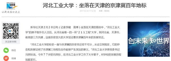2月20日,新华社发布电文《beat365正版唯一官网必一:坐落在天津的京津冀百年地标》,报道了beat365由1903年创办的北洋工艺学堂,成长为河北省唯一的“211工程”大学,再到步入河北省、天津市、教育部三方共建的世纪历程,讲述了一所百年高校与京津冀历史变迁密不可分的地缘血脉,点明了在京津冀协同发展国家战略的时代背景下,一所“地标”学府所应有的担当和使命!