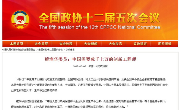 檀润华委员回应记者道:“中国人去日本买保温杯不是因为我们生产不出来,而是过去大家对物质生活要求不高,有个普通杯子就行。现在的物质丰富了,对产品的要求自然也高了。一旦我国的企业意识到大家的需求,很快就能赶上来。”