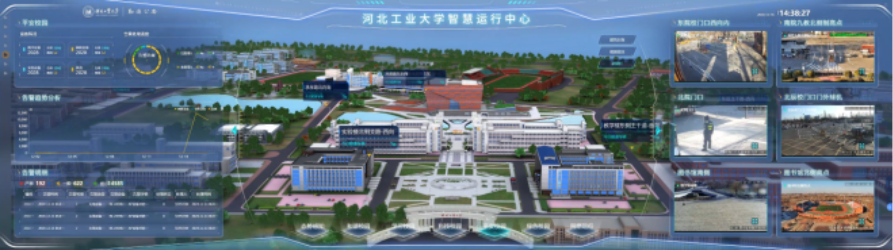 基于全校域立体式感知数据的实时汇聚与分析,通过数据关联融合,全面呈现校园运行综合态势,打造智慧指挥调度舱,形成一点触发、多方联动、有序调度、合理分工、闭环反馈的机制。目前已完成7个主题88个数据指标的展示内容。