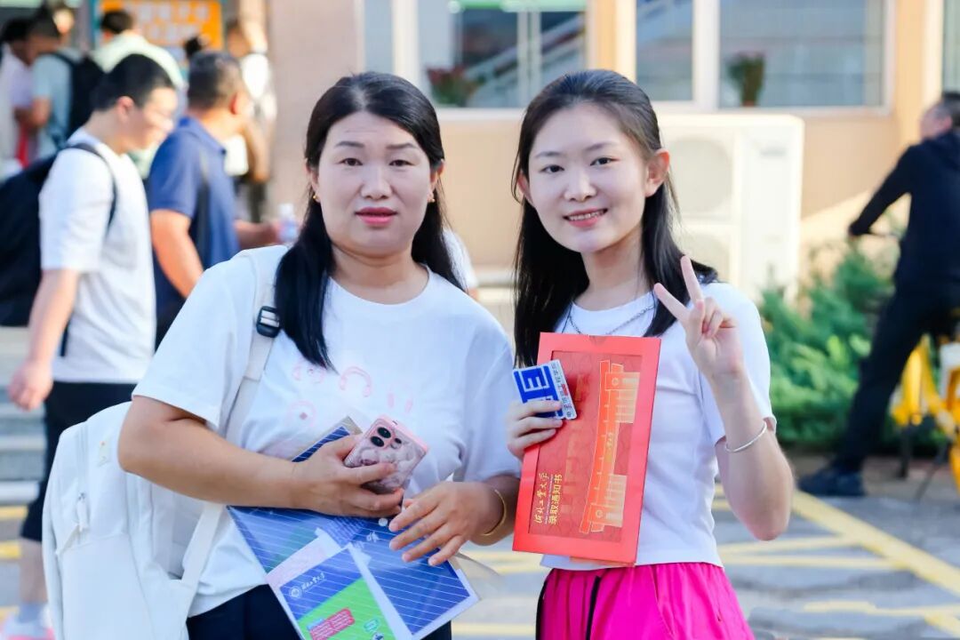 举着手机拍照留念,有的还抱着学校送的迎新小礼物,定格开学第一天!