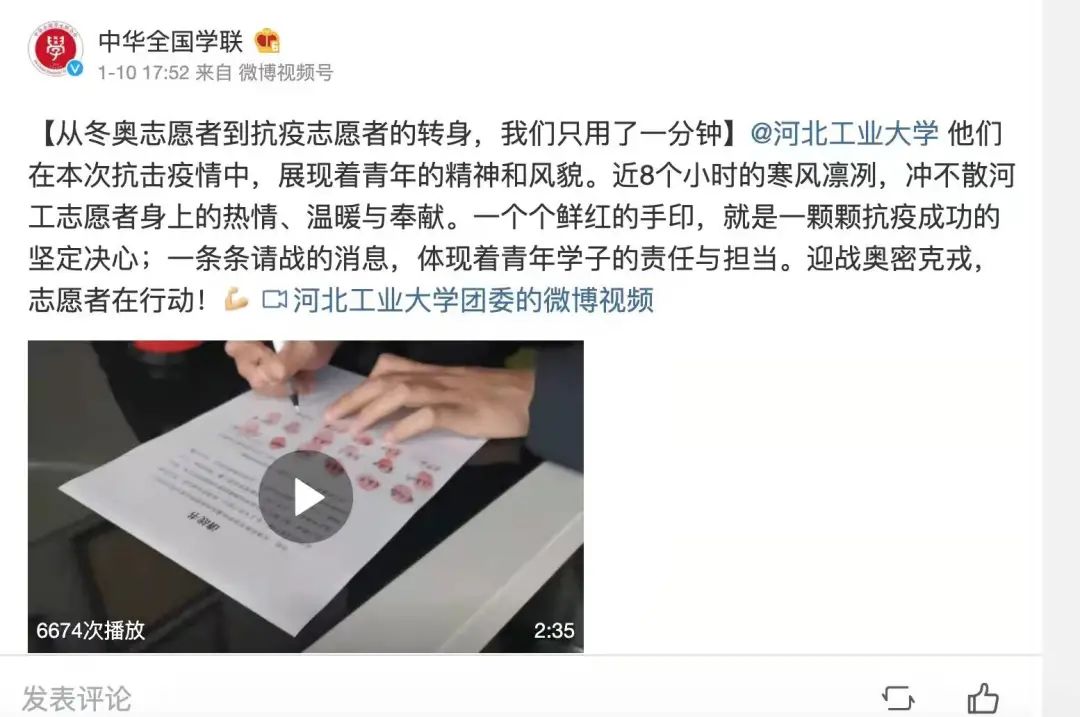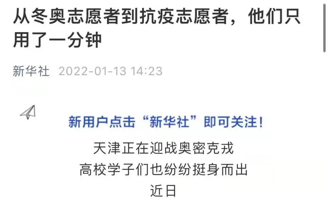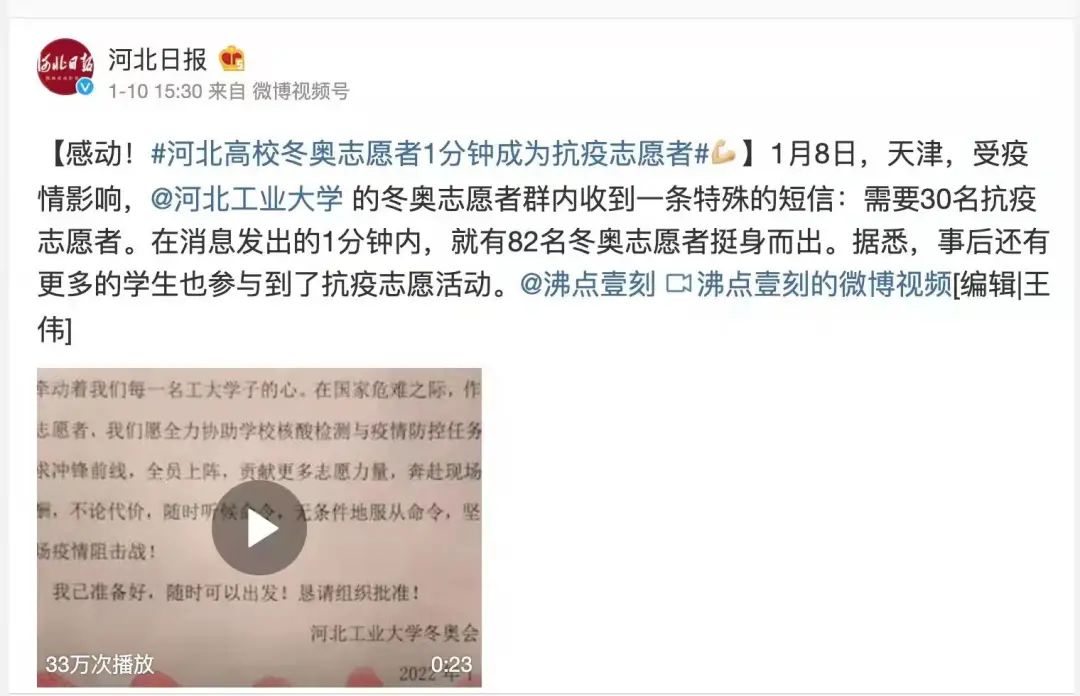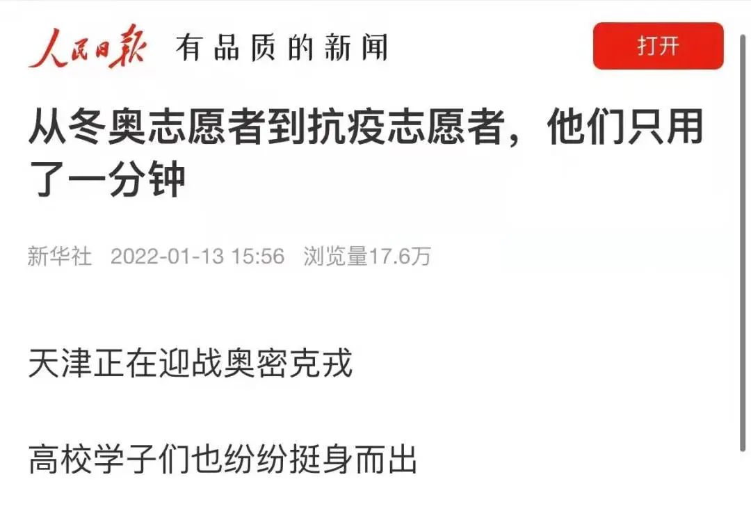 近日,一场与疫情的战斗在天津打响。关键时刻,冲锋在前,beat365冬奥志愿者挺身而出,争先报名抗疫志愿者,青春抗疫事迹受到多家主流媒体关注。新华社、人民日报、人民网、光明日报、学习强国学习平台、中国青年报、中国青年志愿者、中华全国学联、北京青年报、河北日报、扬子晚报、津彩青春、青春河北等主流媒体相继予以专题报道30余次,全网视频播放量约755.5万次,其中新华社单篇报道阅读量约111.7万次。