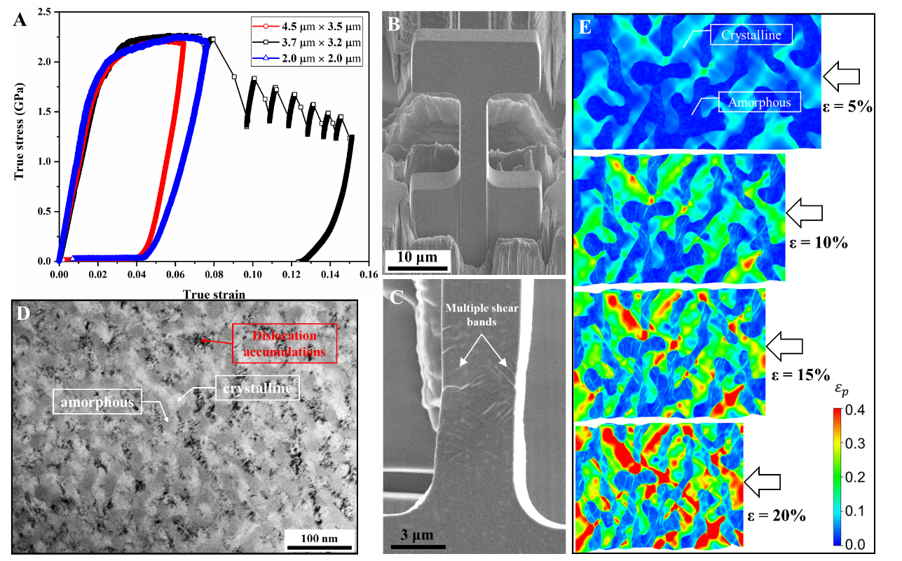 图2. (A)TiZr基纳米晶非晶复合材料的拉伸真应力应变曲线;(B-C)原位拉伸前后样品的SEM图片;(D)TEM分析和(E)有限元模拟表明塑性变形首先均匀发生在晶体区域,然后在非晶区域形成大量均匀分布的微小剪切变形区。