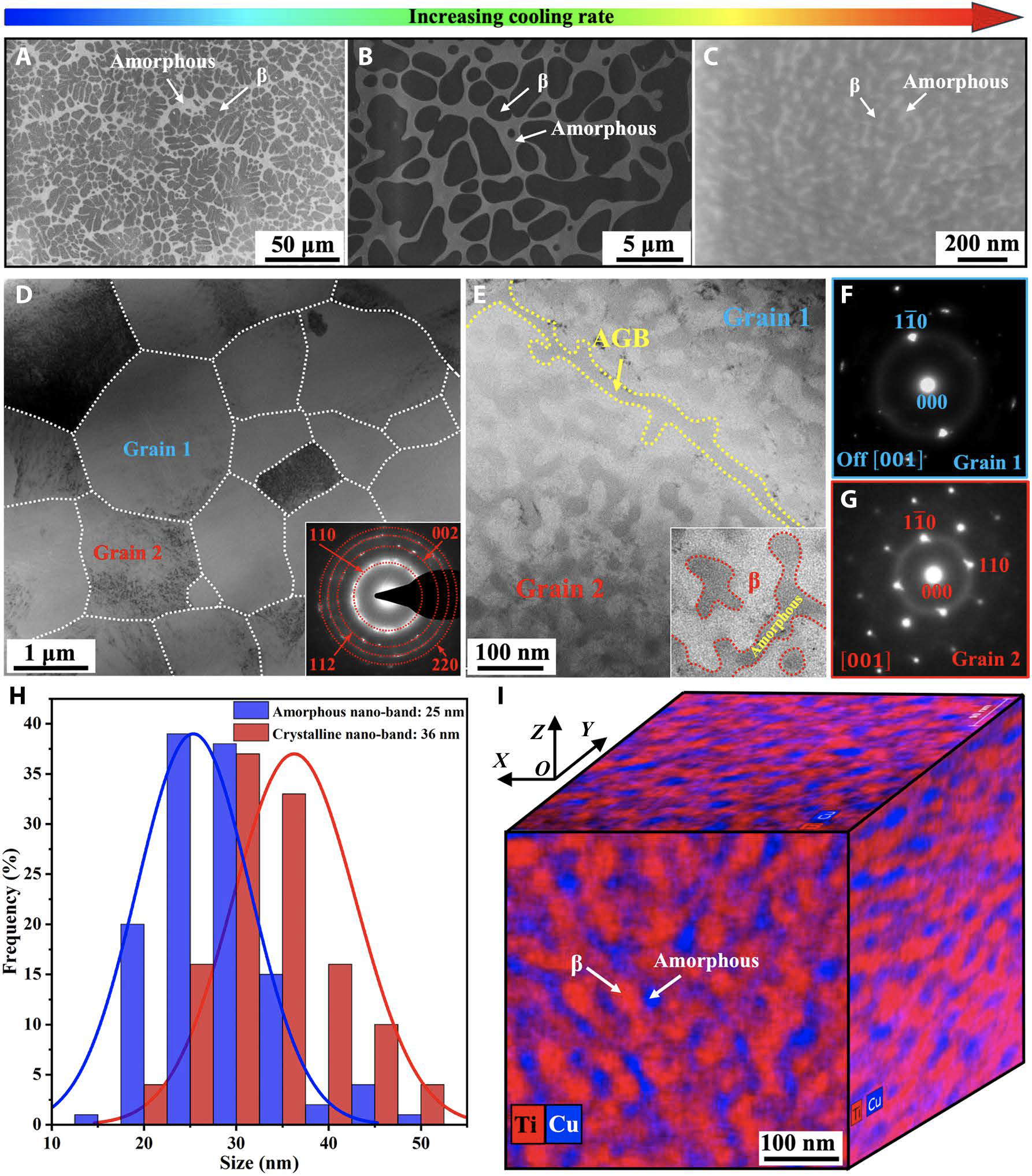 与晶体材料不同,随着特征尺寸减小到纳米级,金属玻璃的变形能力显著增强。因此,由纳米非晶相和晶体相组成的晶体-非晶复合材料有望同时获得高强度和高塑性。作者设计了一种独特的TiZr基纳米晶-非晶复合材料,该合金由等轴的微米晶组成,且每个晶粒内部由三维双连续晶体-非晶纳米双相结构(3Dbicontinuous crystalline-amorphous nanoarchitectures,3D-BCAN) 组成(图1)。