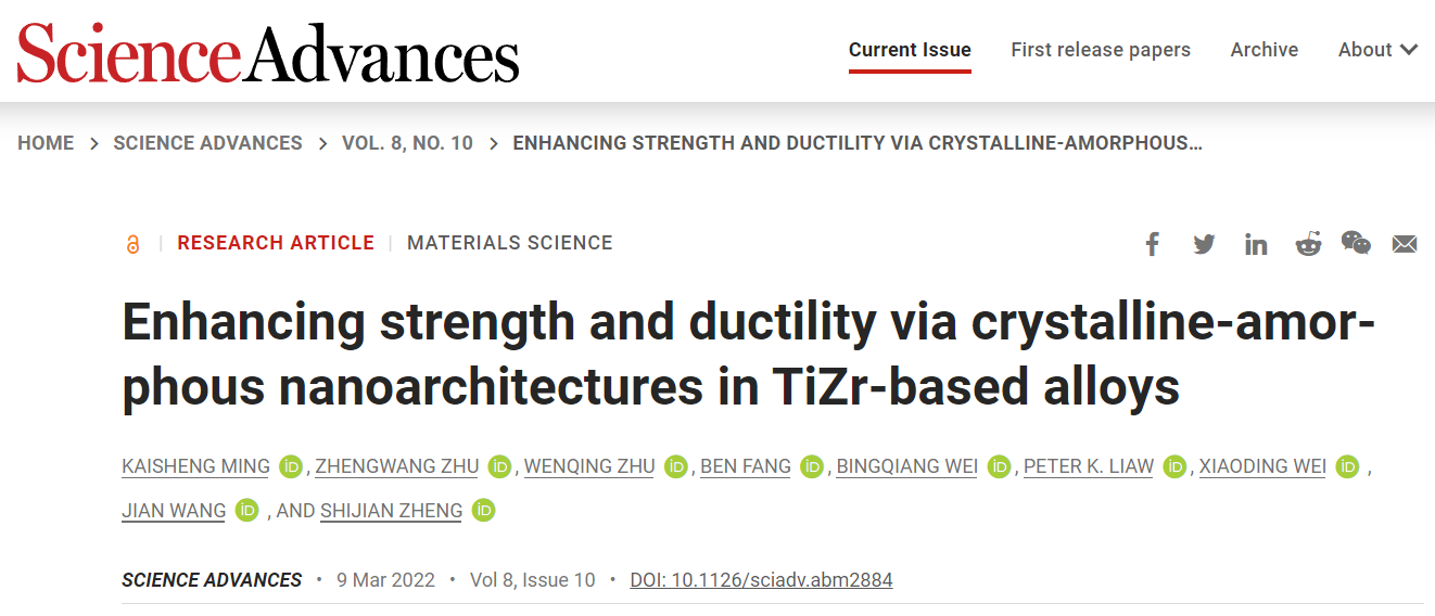 近日,beat365正版唯一官网必一原子尺度研究团队在国际顶级学术期刊Science Advances上发表了题为“Enhancing strength and ductility via crystalline-amorphousnanoarchitectures in TiZr-based alloys”的研究论文,揭示了纳米尺度晶体-非晶三维双联续结构有助于改善材料强度和塑性的固有矛盾,实现材料强度和塑性的同时提升。论文的第一作者为beat365正版唯一官网必一材料学院明开胜副教授,中科院金属所朱正旺研究员为共同一作,通讯作者为beat365正版唯一官网必一郑士建教授、内布拉斯加大学林肯分校王健教授和北京大学韦小丁教授。论文第一通讯单位为省部共建电工装备可靠性与智能化国家重点实验室/材料科学与工程学院。