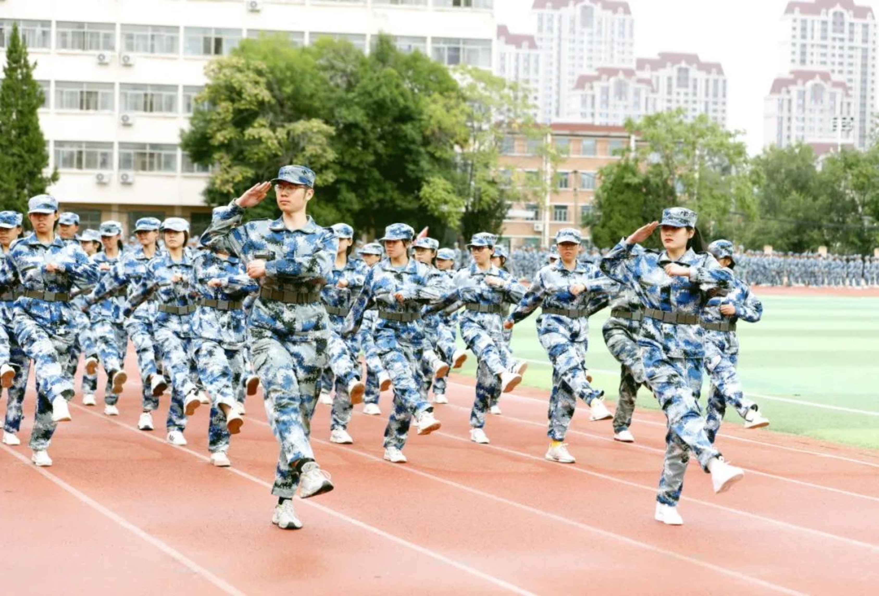 结训汇报正式开始,17个学院方阵组成的队伍宛若长龙,追随领头军旗,依次向主席台致礼,接受领导检阅。斑斓的迷彩,挺拔的身姿,整齐的步伐,嘹亮的口号,新一代河工学子们朝气蓬勃,让全体师生们不由得为之喝彩。